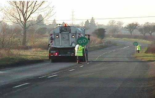 the working width of the unit is 2300mm (maximum working width is 2800mm and minimum 500mm.) Water at a pressure of between 200 and 550 bar was applied via a hydraulically driven rotating arms containing variable angle nozzles, which are completely contained within their own housing to prevent egress of water and for safety. Traffic management is established at the limits of the working site and whilst operational, traffic is controlled by mobile ‘stop’ and ‘go’ operatives, who are linked by two-way radio sets. Because rates of progress are routinely achieved of 8-10 linear meter’s/minute, delays to traffic are minimal. |